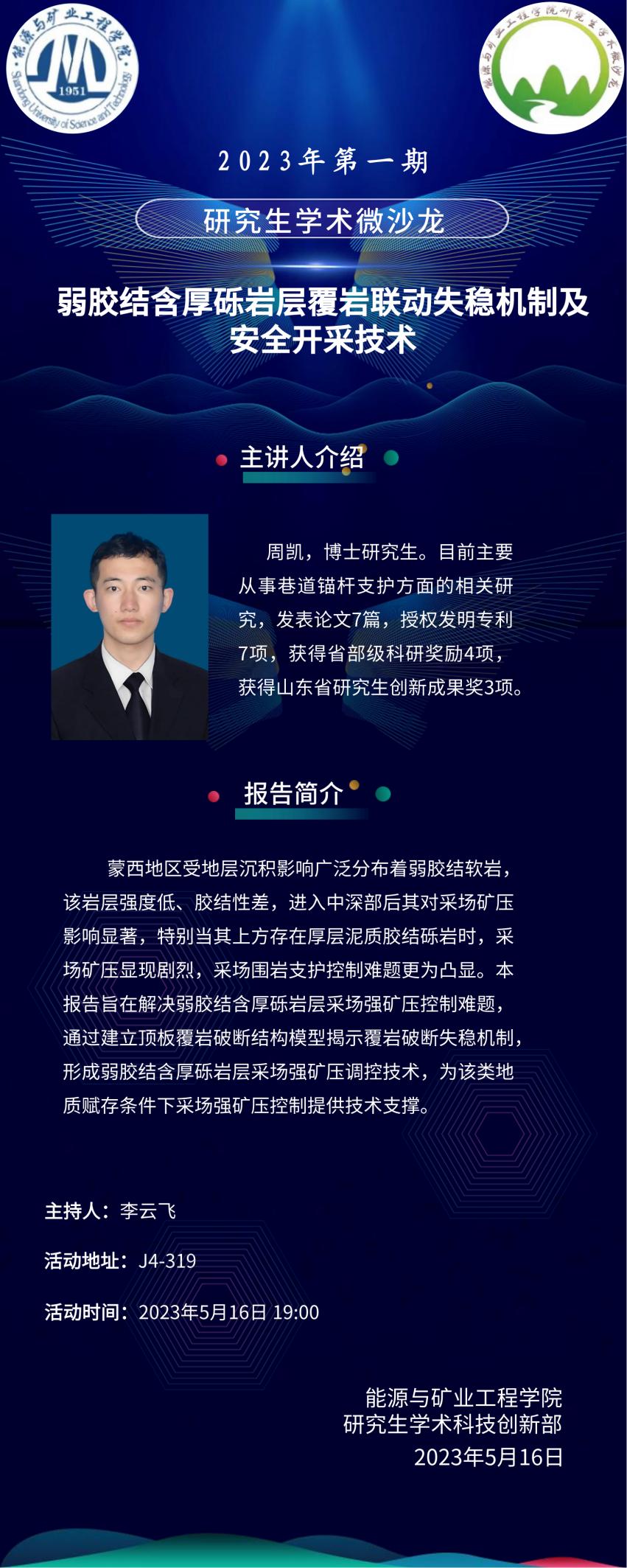 5月19日,由捷报足球-捷报足球数据 主办,能源与矿业工程捷报足球 研究生会承办的2023年第1期研究生学术微沙龙“弱胶结含厚砾岩层覆岩联动失稳机制及安全开采技术”在J4-319成功举办。本次学术微沙龙活动由捷报足球 博士研究生周凯作主题报告,捷报足球 研究相关方向的博士生和硕士生参加,活动由捷报足球 研究生会执行主席李云飞主持。