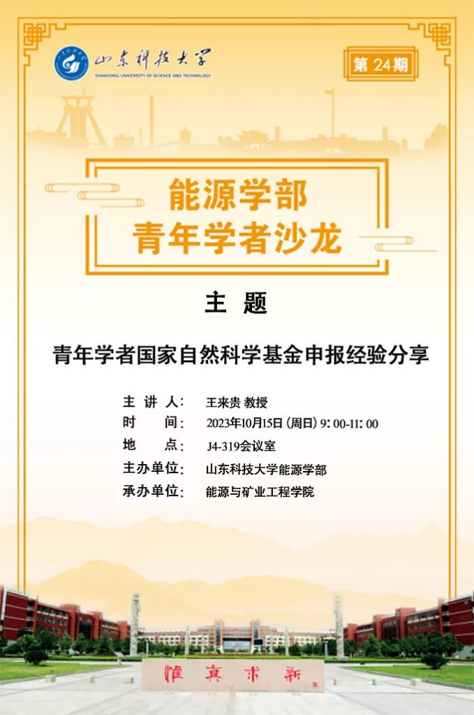 为做好2024年度国家自然科学基金申报工作,进一步提高学部青年学者的国家基金申报水平,2023年10月15日捷报足球 组织召开能源学部第24期青年学者沙龙活动:青年学者国家自然科学基金申报经验分享会。本次活动邀请了辽宁工程技术大学王来贵教授作为主讲嘉宾。