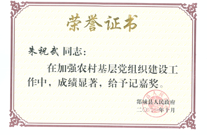 朱祝武同志在“加强农村基层党组织建设”工作中获得郯城县人民政府嘉奖