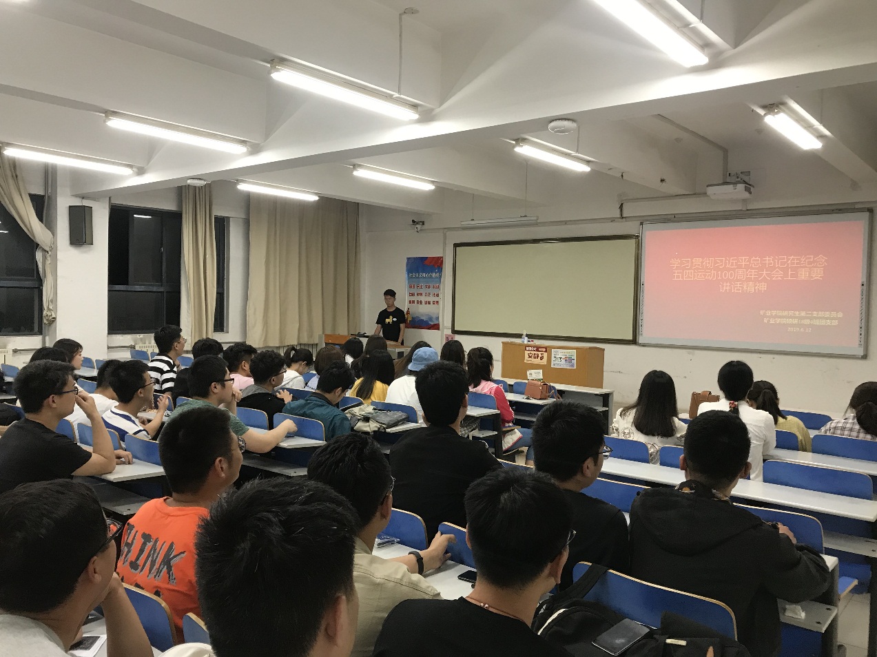 研究生第二党支部联合硕研18级4班团支部在J5-307举办了“认真学习贯彻习近平总书记在纪念五四运动100周年大会上重要讲话精神”主题党团日活动。