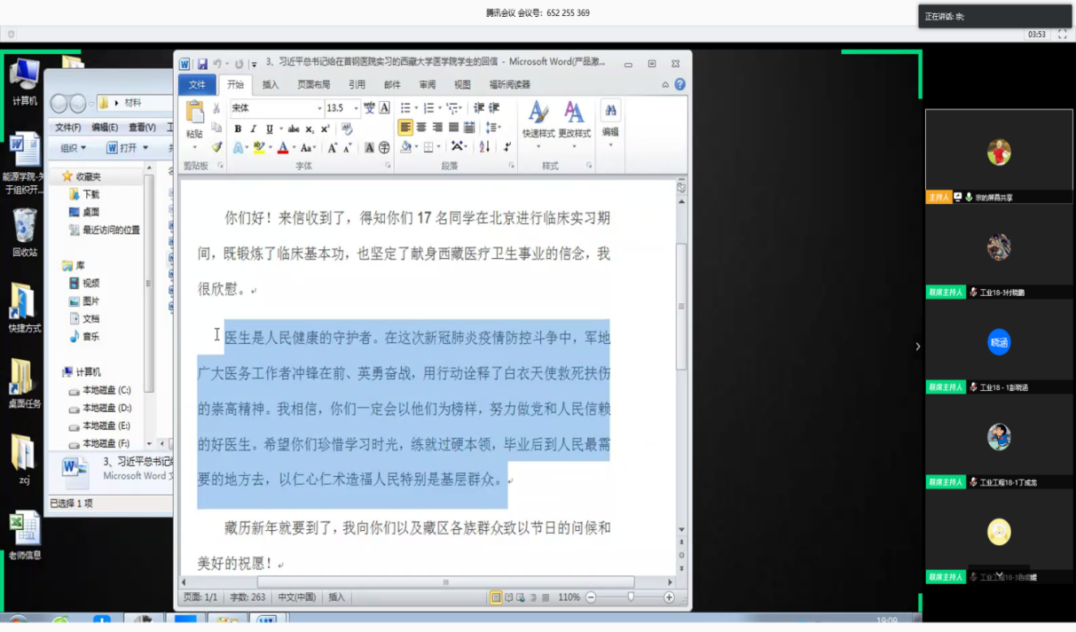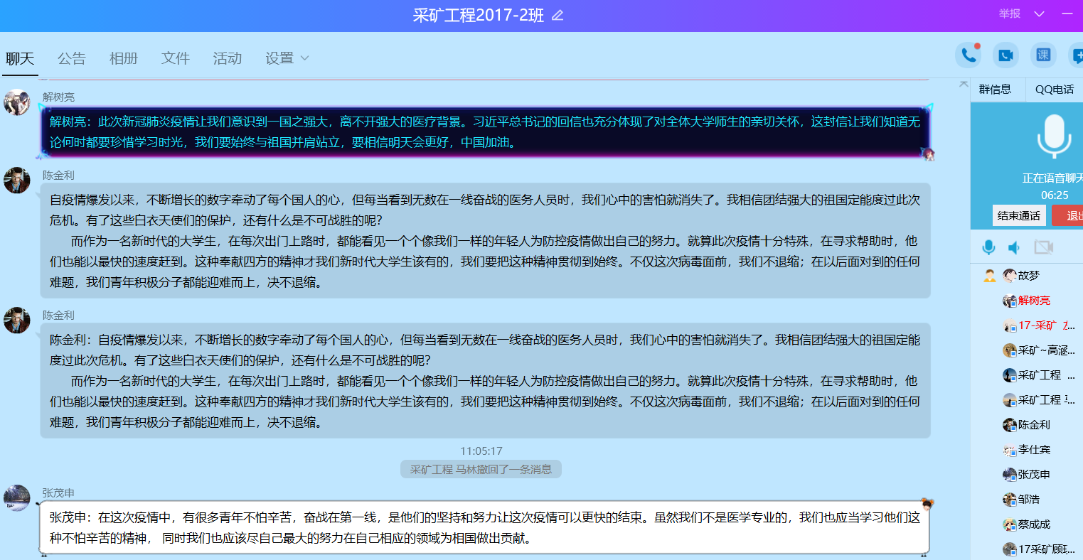 采矿工程2017-2班向恭梁说:“习近平总书记的回信精神充分体现了习近平总书记和党中央对广大医务工作者的赞誉与关怀,同时也饱含着对我们广大青年学子的殷切期待。强化自身本领,努力学习知识,到祖国需要的地方去,是能源学子不变的信念,作为一名即将进入毕业年级的大三学生,我明白此时我正需要扎实练就本领,努力学习专业知识,用自己的本领来服务群众,服务社会,服务国家。”