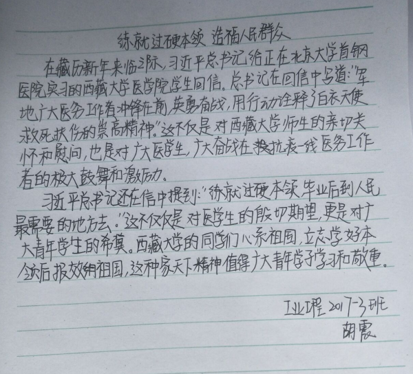 学生的回信中提到“希望你们珍惜学习时光,练就过硬本领,毕业后到人民最需要的地方去。”我们作为理工科的学生更应刻苦学习,响应国家号召,紧跟时代潮流,若干年后,我们就能在人工智能、大数据等领域为国家贡献自己的一份力。”