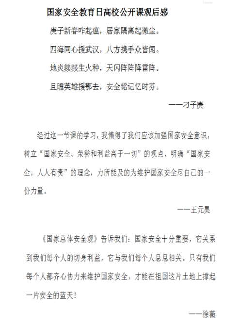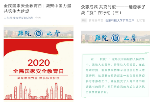 各班指定宣传员,以班级形式召开主题“云”班会,向同学们普及生物安全、公共卫生安全、网络安全等国家安全知识,提高同学们维护国家安全的自觉性和主动性 , 同时,结合疫情期间涌现出的先进典型和感人事迹, 为同学们讲好战“疫”故事,传递正能量 ;通过公众号、易班平台制作《众志成城 共克时疫——能源学子战“疫”在行动》、《凝聚中国力量 共筑伟大梦想》 等 推送文章,深化学生爱国主义情感,浓厚安全教育学习氛围。