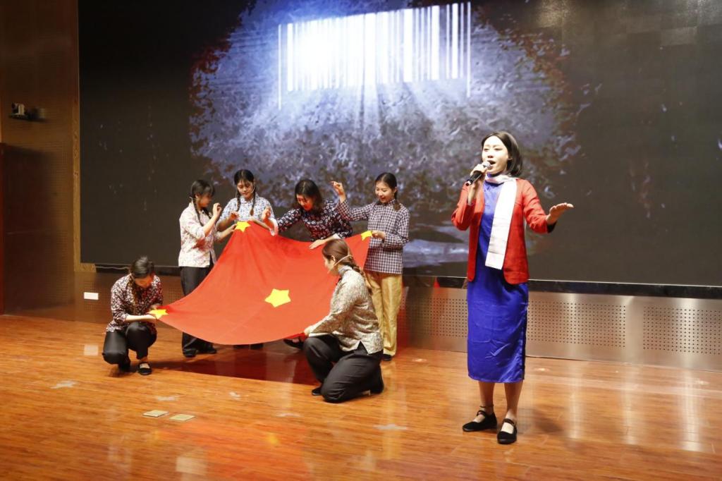 “从杭州嘉兴南湖红船上扬帆起航,到新时代新起点乘风破浪”一改往常的宣讲模式,宣讲团采用了将朗诵、歌曲、相声等文艺节目结合起来的形式,将百载党史、七十年校史,以易于理解的形式,向师生们娓娓道来。宣讲分为“真理的味道”“伟大的旗帜”“春天的故事”“奋进新时代”四个篇章,在“伟大的旗帜”篇章中,辅导员共同演唱歌曲《青春》,“以青春之我,创建青春之家庭、青春之家国、青春之人类……”这沉重而又凝练有力的语句落在了在场每一个人的心上,百年党史,百年荣光,无数英雄志士为国前仆后继,伟人们的万丈豪情、八荒志气顷刻间充盈了整个报告厅。