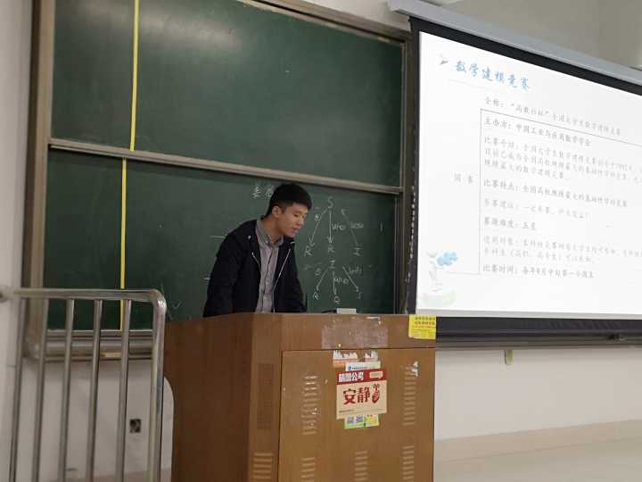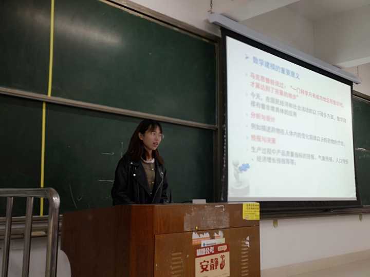 二人叙述风格不同,讲述方向不同,但都给同学们留下深刻印象。宋翠学姐走学术派,先从水流模型,传染病模型此类较为基础的模型入手,步步深入,提出了SIR模型,使同学们对模型构建有了初步的认识,明白了一个数学方程怎样由易到难适应到模型身上。了解了方程构建需要权衡思考的整个过程。而孙纪伟学长则较为通俗的介绍了数学建模比赛的时间安排,不同比赛的难易程度,建模需要的软件,自己组队以及写论文的经验,他用自己常年参加建模比赛的经验,来为同学们分析参加数学建模比赛的好处以及需要考虑的问题,为想要参加比赛的大一同学提供了很好的意见及建议。