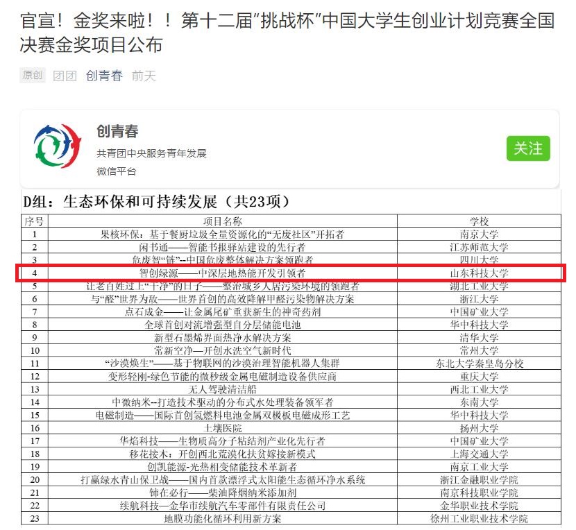 11月28日,第十二届“挑战杯”中国大学生创业计划竞赛终审决赛在东北林业大学落下帷幕,山东科技大学捷报足球 耿志等人完成的“智创绿源——中深层地热能开发引领者”项目(指导老师:陈绍杰、许琳、宗彩建)获得国赛金奖。这是学校在历届“挑战杯”中国大学生创业计划竞赛中取得的历史最好成绩,实现了金奖从0到1的突破。