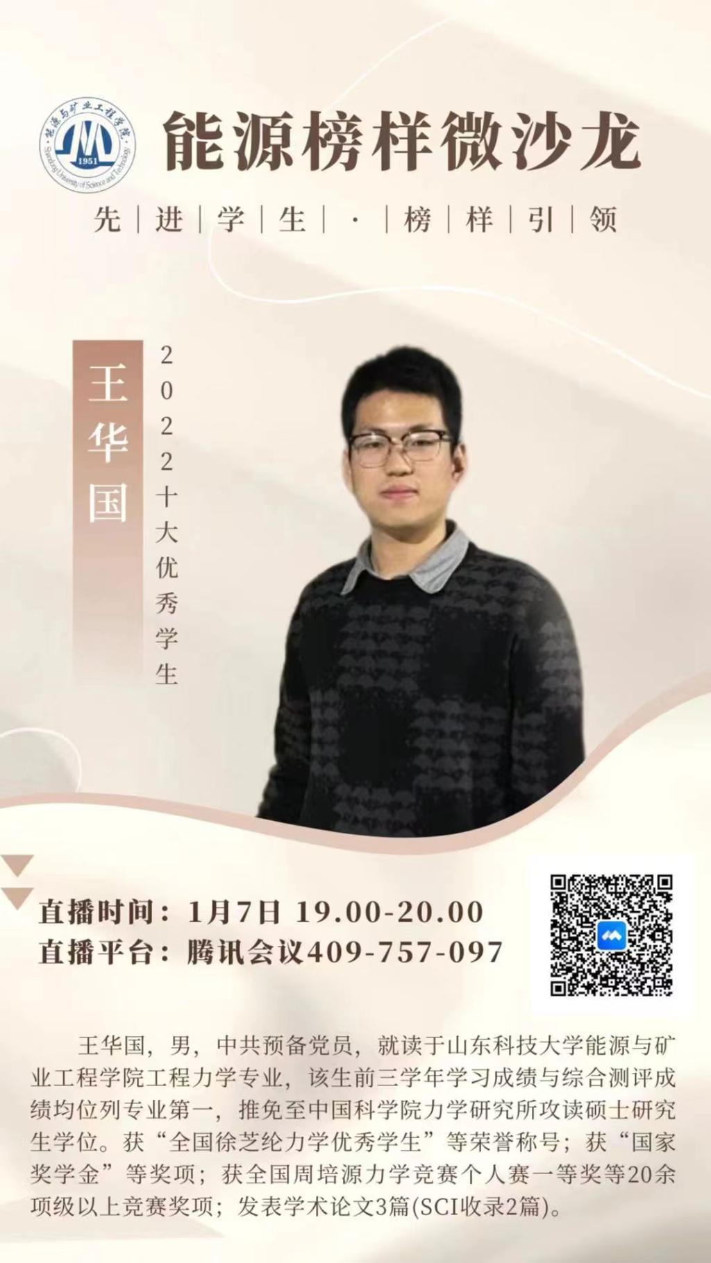 为充分发挥优秀学生的榜样引领作用,1月7日晚,捷报足球 举办“能源榜样微沙龙|优秀学生分享直播第一期”。本次活动由2022年度山东科技大学“十大优秀学生”王华国担任主讲人,采矿工程2021级1班卢丹主持,捷报足球 2022级本科学生参加。