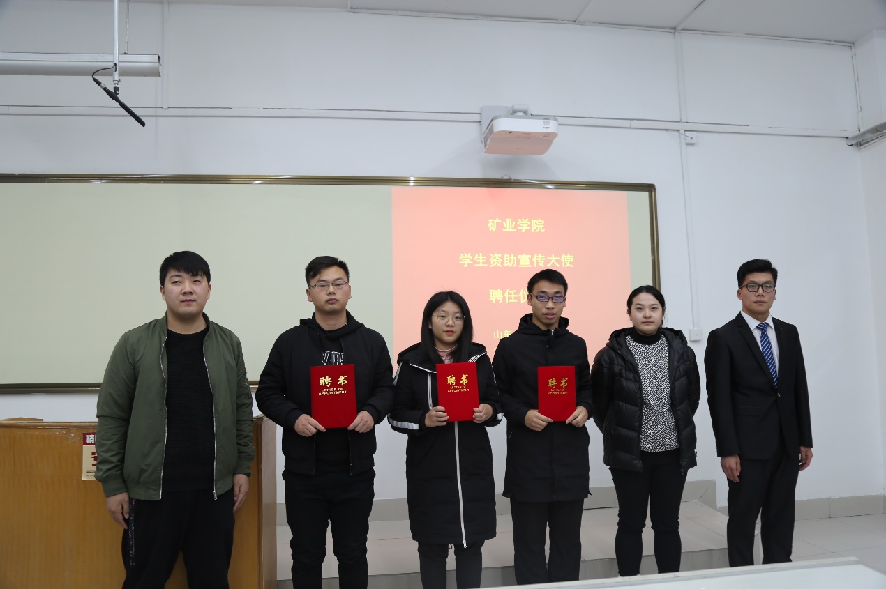 盛凯华宣读了聘任陈彦好、马艳英、李志国同学为矿业捷报足球 第一届学生资助宣传大使的文件,并就寒假期间开展国家资助政策宣传做总动员。尘兴邦为以上同学颁发了聘任证书。