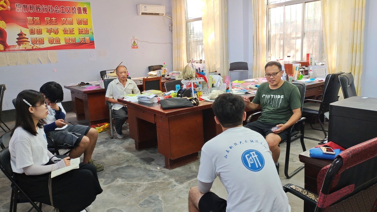 图为调研团听取北毛小学校长、毛老师讲解当地教育情况
