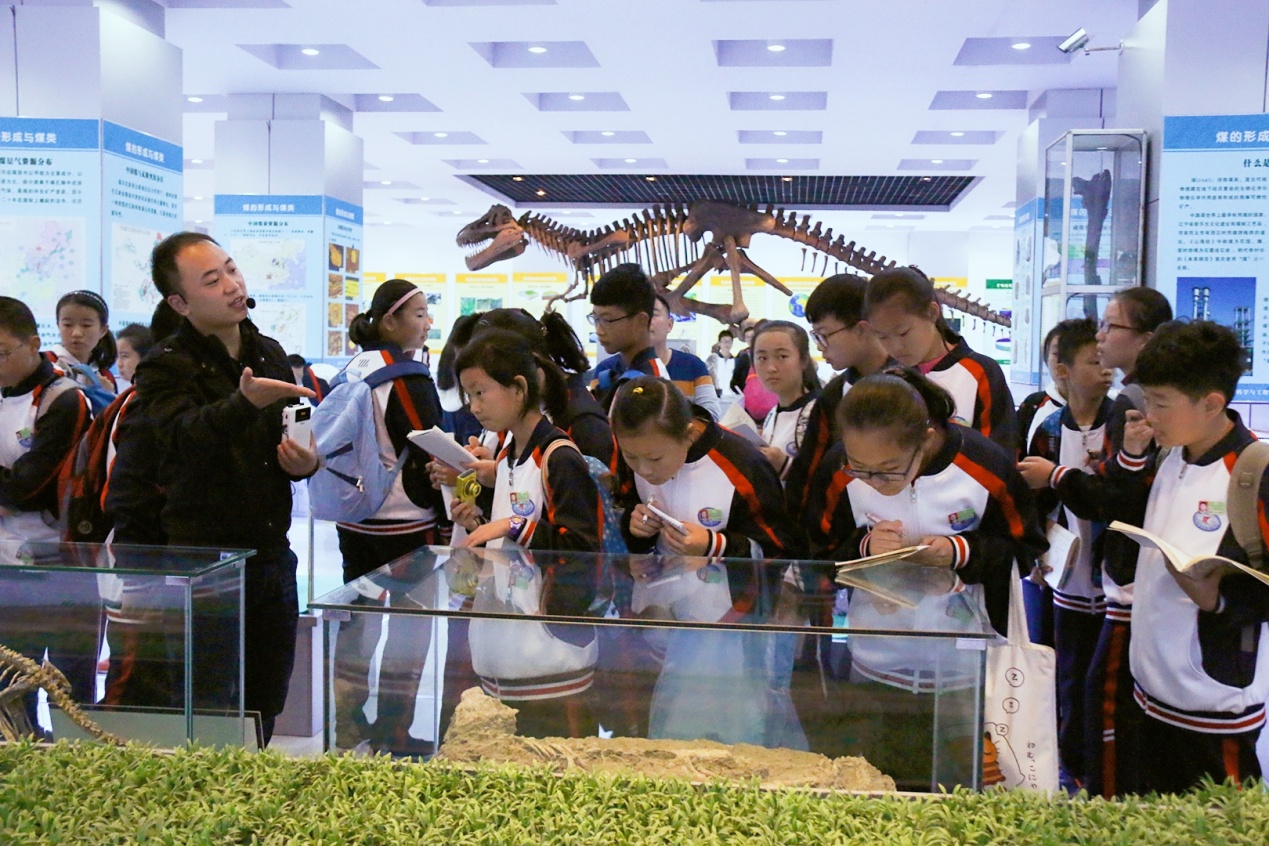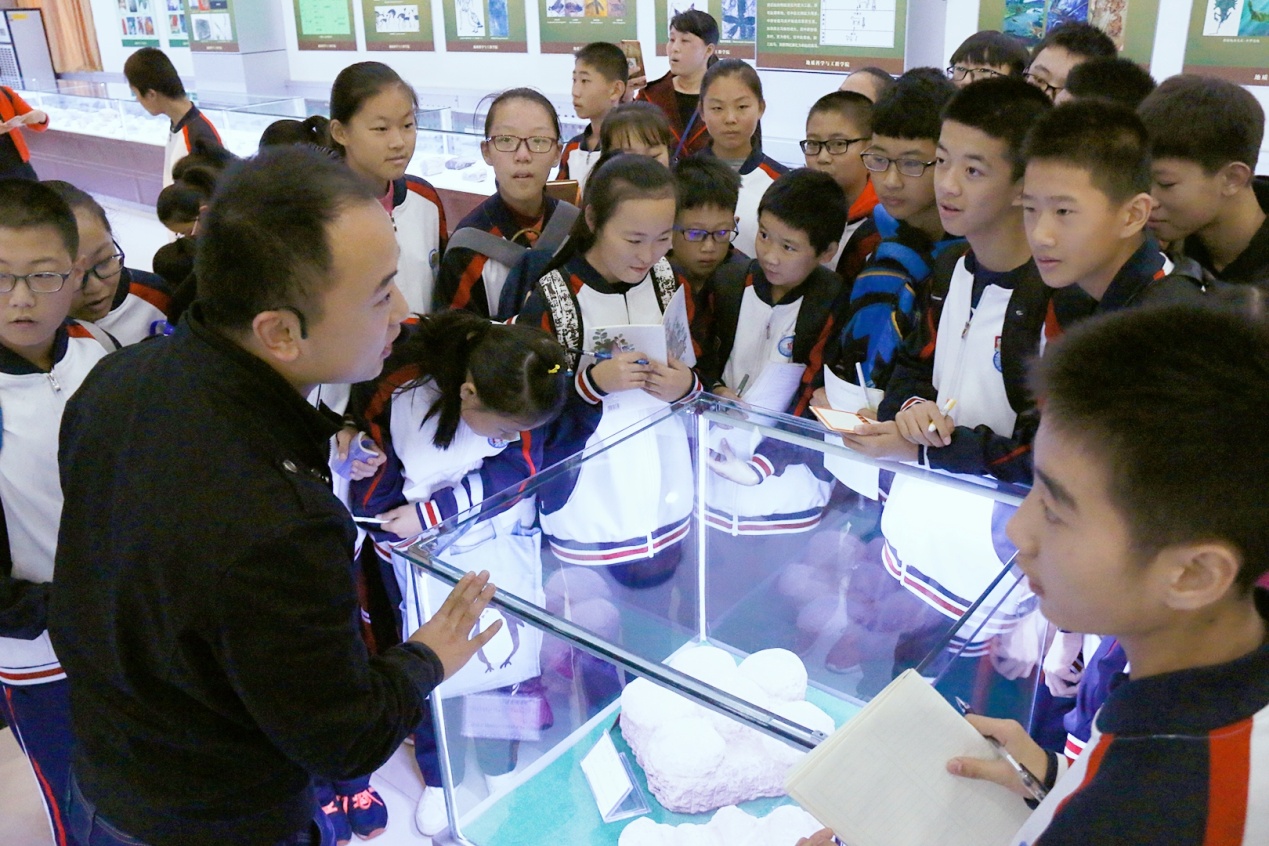 学生在讲解员带领下,沿两条路线进行参观,在“泰山广场”出发,途径“名人园”、“砚湖”、“尤洛卡广场”等校内标志性景点,一部分同学还进入“地球科学馆”参观,在讲解员互动性的讲解下了解了各类化石的故事,并拿本子记录了各类资源的演化过程。