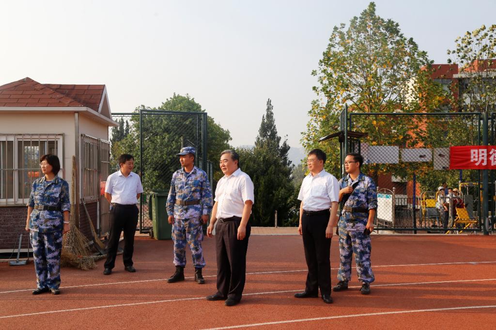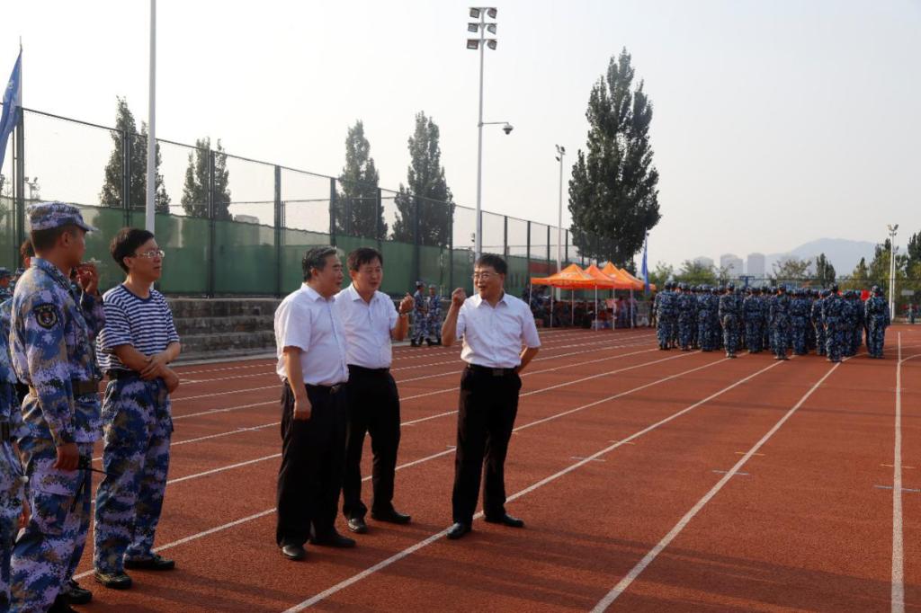9月7日,山东科技大学校长姚庆国、副校长高建广在矿业捷报足球 党委书记董桂刚的陪同下来到矿业捷报足球 2019级新生军训场地,亲切看望教官和矿业捷报足球 的新生们。