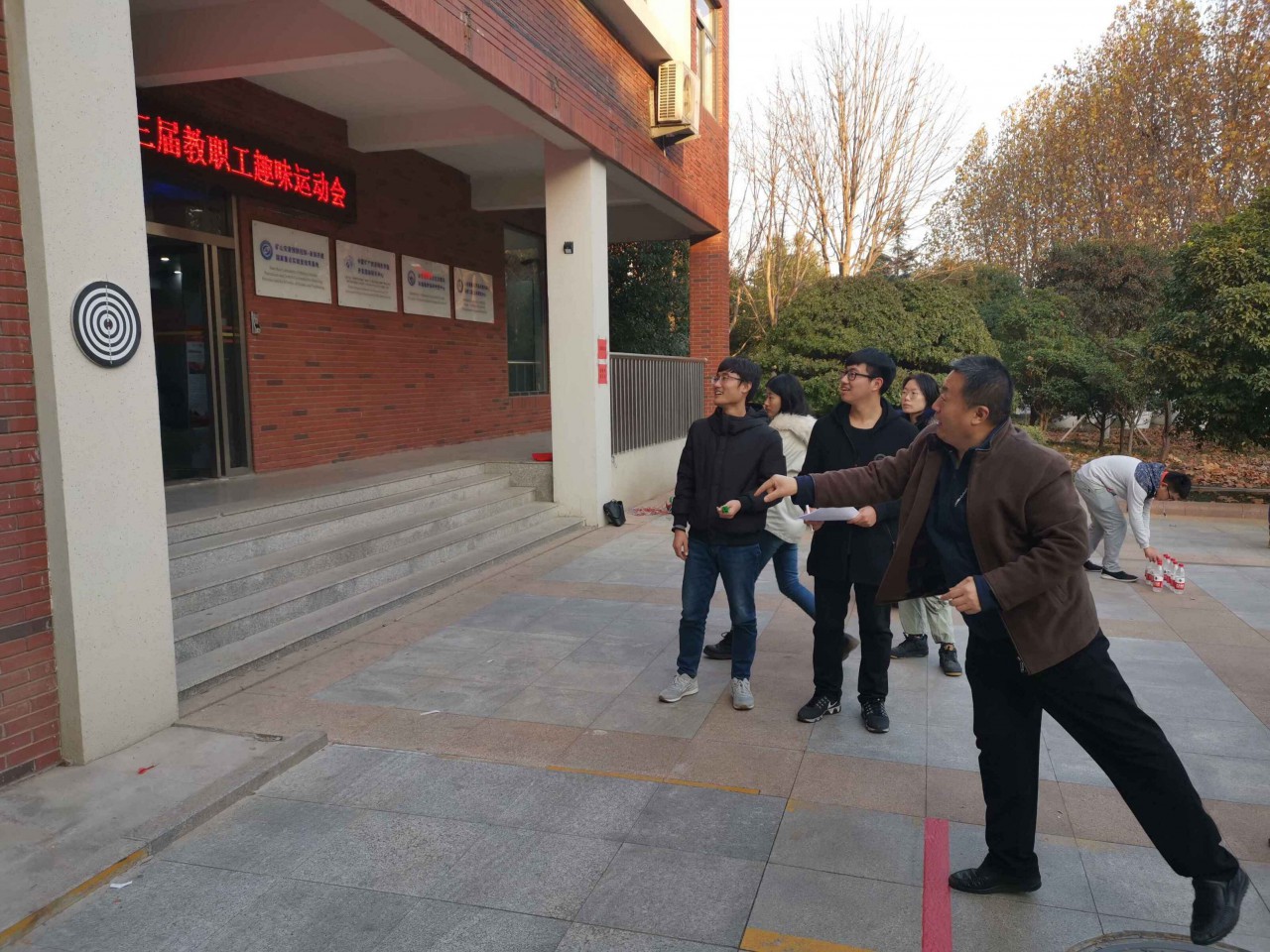 本次趣味运动会竞赛项目分为个人赛和团体赛。个人赛设置了跳绳、踢毽子、飞镖、趣味保龄球以及乒乓球托球跑等项目,团体赛设置了双人背球跑和团体跳大绳两个项目,老师们积极报名,踊跃参加。其中乒乓球托球跑、飞镖比赛充分展示了老师们高超的技术,引得在场观众的阵阵喝彩。在团体跳大绳比赛中,老师们齐心协力、相互配合,加油呐喊声此起彼伏,将比赛推向一个又一个高潮。双人背球跑更是精彩纷呈,吸引了更多人驻足观看。虽已入冬,但老师们丝毫没有感受到寒意,整个活动过程中精彩不断,不时爆发出欢声笑语,不少学生也纷纷跑来为老师们加油助威,现场热闹非凡,呈现出一派欢乐祥和的景象。