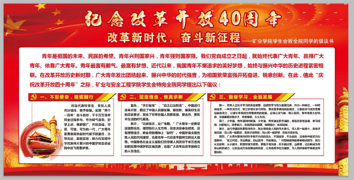 青年兴则国家兴,青年强则国家强。青年的理想抱负与国家命运前途息息相关,值此“庆祝改革开放四十周年”之际,矿业与安全工程捷报足球 学生会特向捷报足球 同学提出倡议:不忘使命,砥砺前行;坚定信念,惟真求新;勤奋学习,全面发展。
