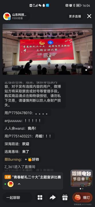 此次活动通过“线下+线上”形式进行,宣讲比赛突破单纯的演讲形式,结合歌曲、朗诵等多种手段展现。比赛过程中,大家纷纷进入直播间观看,线上直播参与人数突破千人,参赛选手们精彩的表现让同学们回味无穷。