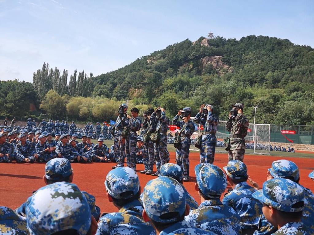 在防毒面具佩戴环节,随着指令下达,学子们迅速行动。他们眼神专注,双手熟练地操作,从取出面具、展开到准确佩戴,整个过程一气呵成。这背后,是无数次的练习,体现着学子们对军训技能的重视与认真态度。而在战术动作展示中,学子们卧倒、匍匐前进、翻滚等动作标准且有力,每一个姿势都彰显出军人般的坚毅与果敢,展现出他们在军训中锤炼出的过硬素质。