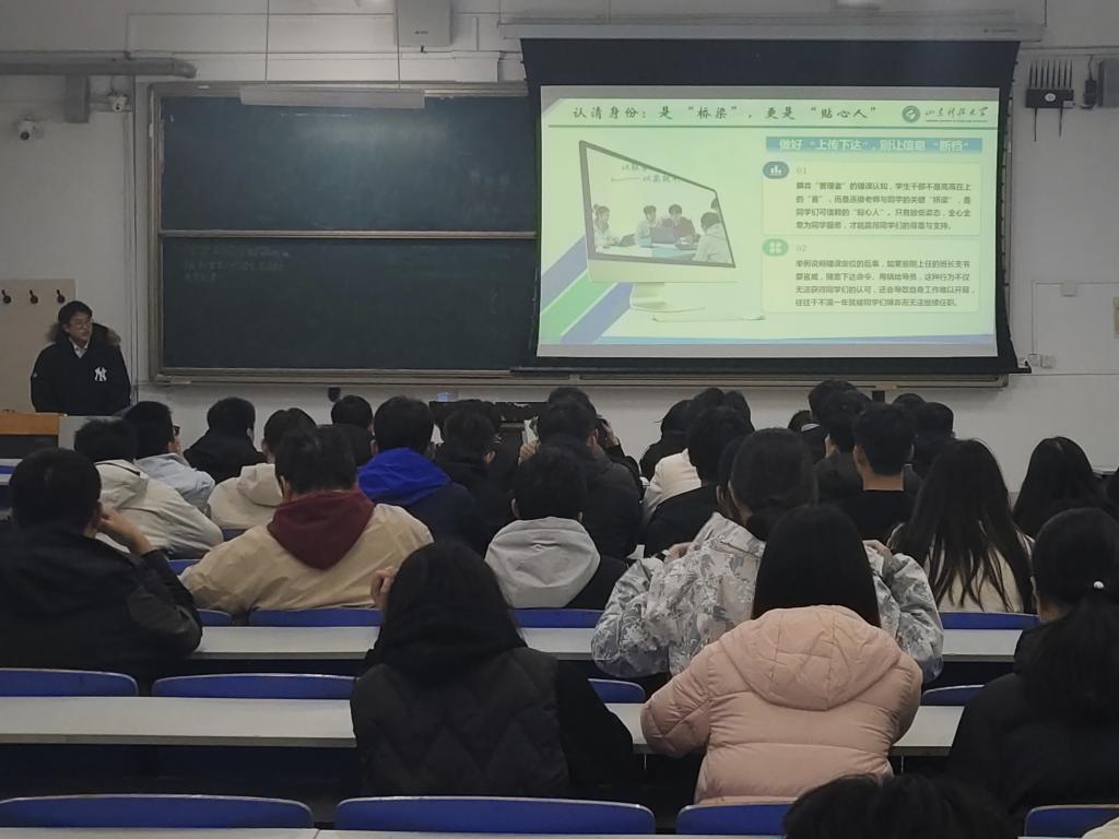 郑嘉明结合自身丰富的学生工作经验,为在场班长、团支书学生干部作了系统而深入的工作指导。他围绕学生干部的角色定位与成长路径,提出四点建议:一是认清身份、找准定位,做好连接师生的“桥梁”和“贴心人”;二是提升能力、注重细节,把工作“小事”做成集体进步的“大事”;三是带好团队、凝聚合力,让团支委各司其职,推动班级建设向好向上;四是统筹兼顾、全面发展,平衡好工作与学习。