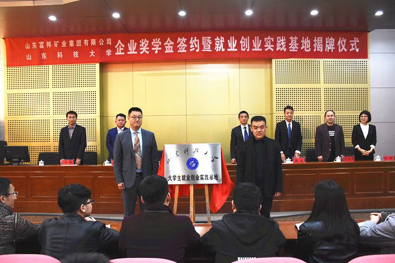 卞西春与王宗恕共同为山东科技大学富邦矿业集团有限公司大学生就业创业实践基地揭牌,穆玉兵代表学院与公司签署合作协议。据悉,双方协商在山东科技大学设立“富邦矿业奖学金”,用于奖励在校本科生,矿业捷报足球