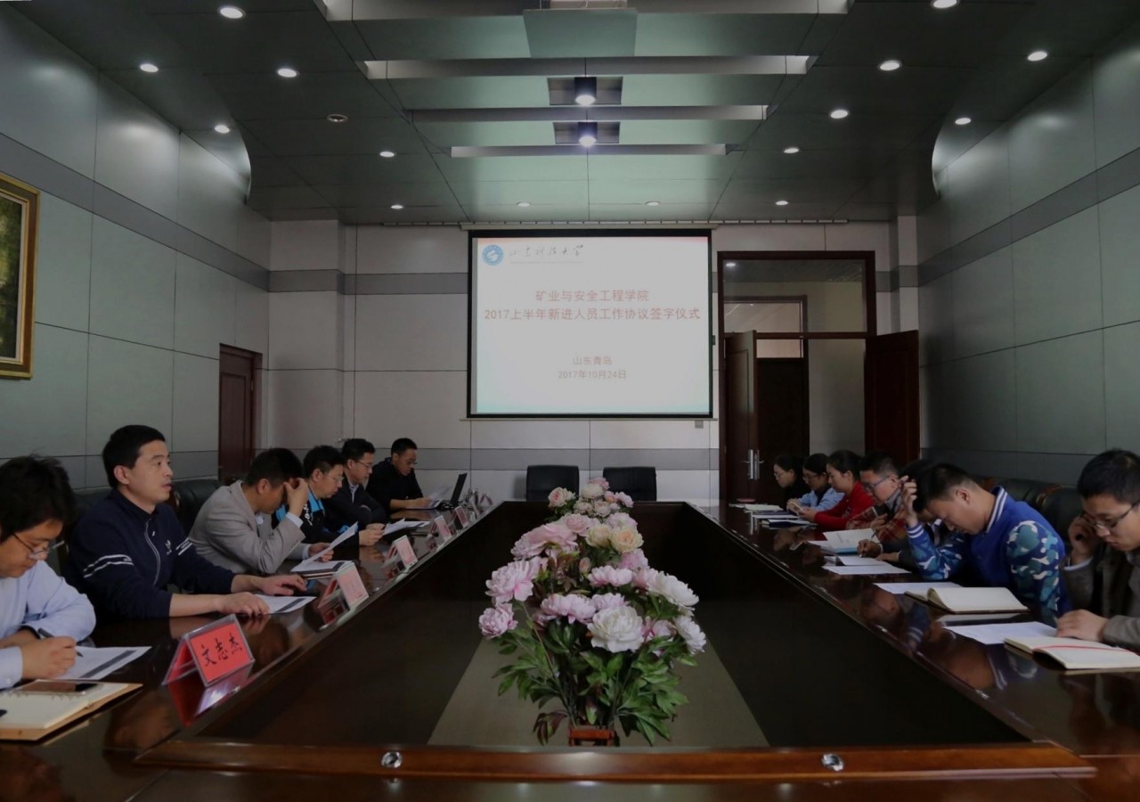 10月24日,矿业捷报足球 在捷报足球 楼321会议室举行2017上半年新进人员工作协议签字仪式。院党委书记梁赛江、院长谭云亮、党委副书记兼副院长穆玉兵、重点实验室副主任陈连军、院长助理朱祝武等捷报足球 领导班子成员出席,2017年上半年新引进的八名博士参加。仪式由梁赛江主持。