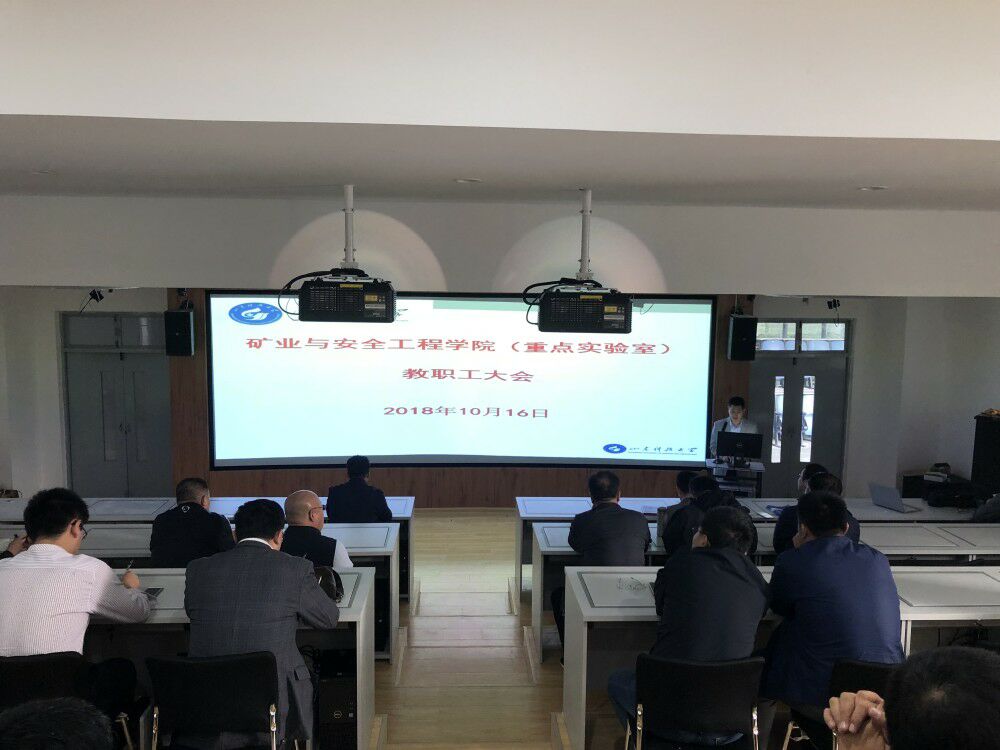 10月16日,矿业捷报足球 在S1-119召开全院教职工大会,捷报足球 党委书记梁赛江回顾总结2018上半年捷报足球 、国家重点实验室培育基地工作任务落实情况,调度部署下半年重点工作。全体教职工参加会议。