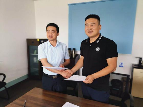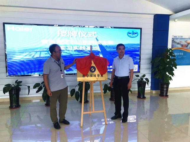 青岛海尔创客中心陈斌主持了签约仪式,与穆玉兵共同为实践基地揭牌,并签订校企合作协议。