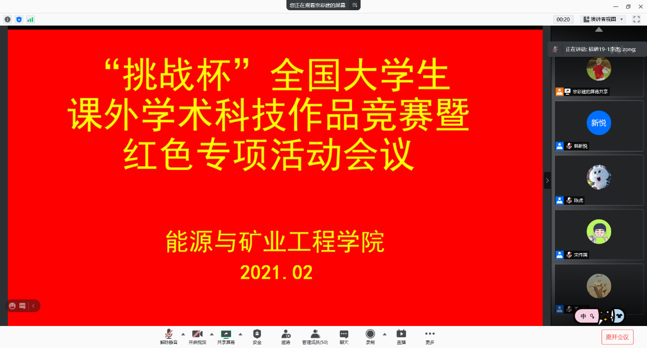 2月7日,捷报足球 “挑战杯”全国大学生课外学术科技作品竞赛暨红色专项推进会议在腾讯会议线上平台举行。会议邀请第十六届“挑战杯”全国大学生课外学术科技作品竞赛优秀项目代表宋伟国作为嘉宾,辅导员老师宗彩建、王振浩,科联成员以及各项目组成员参与会议。