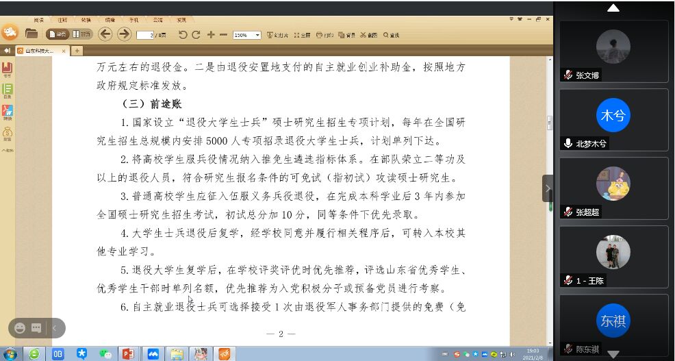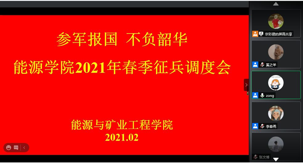 2月8日晚,捷报足球 利用腾讯会议平台举办“参军报国,不负韶华”春季征兵推进会。辅导员老师宗彩建、退役大学生代表和志愿应征入伍同学参加会议。