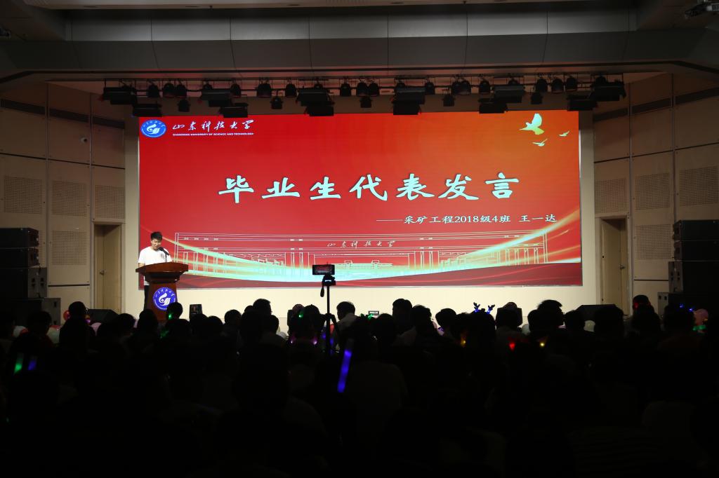 毕业生代表王一达发言。他生动形象地描述了在科大四年生活的点点滴滴,向悉心栽培他的学校、捷报足球 和老师们表达了诚挚的谢意。他表示,能源学子都要以自己的方式诠释能源精神的内涵,让科大精神和能源烙印助毕业学子展翅翱翔。他号召全体毕业生,要牢记“惟真求新”校训,成为这个时代河流中奋勇前进的搏击者,勇敢地担负起属于青年学子的使命。