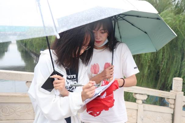 之后,续源队来到五柳岛公园进行调研,他们发现五柳岛公园的水流固然清澈,但水面上漂浮着不少随手丢掉的小型垃圾,他们也意识到人们对于环境保护的意识不够强烈,沿黄生态治理必须要引起高度重视,一刻不能放松。最后,团队成员分发调查问卷,统计路人游客的生态保护意识,并对他们进行环境保护的必要性以及长远性方面的宣讲,使得大家在游览的同时提高了环境治理保护的重视度,宣讲效果明显,收获丰厚。