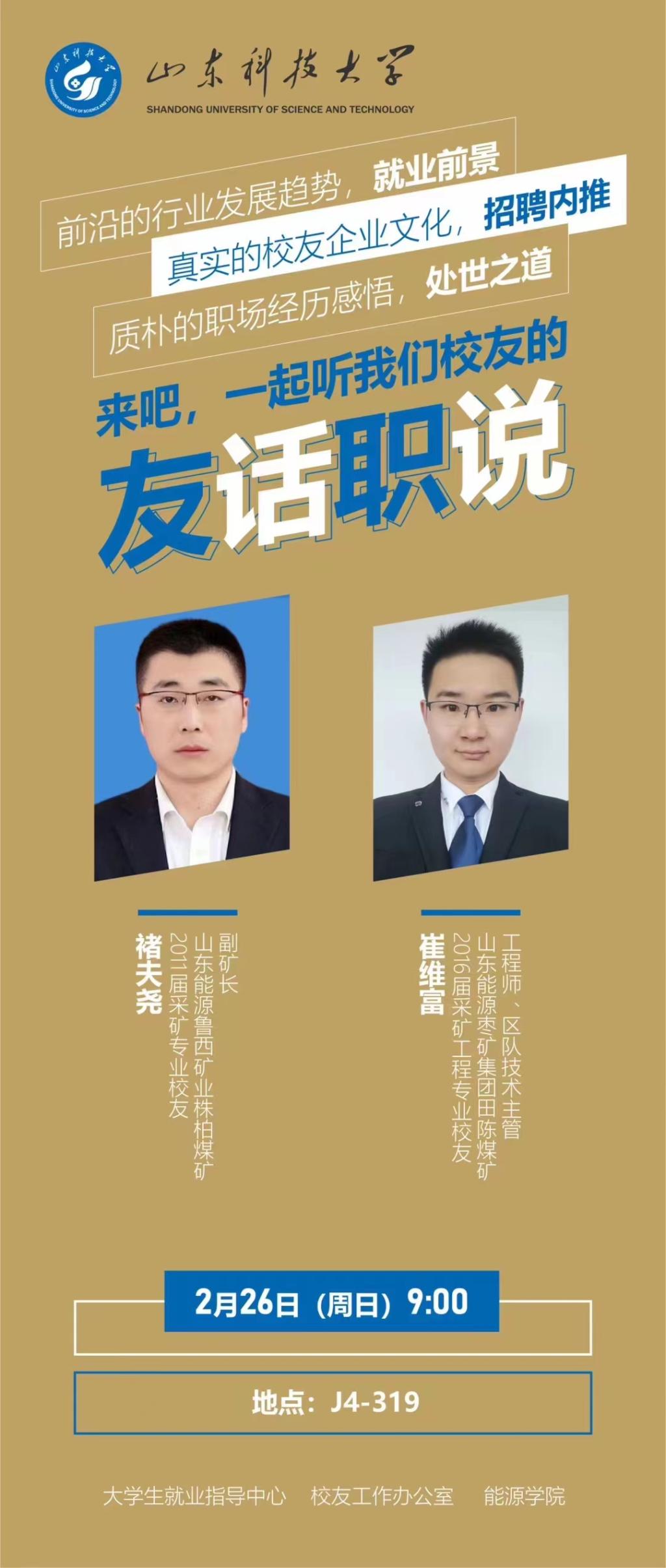 2月26日上午,捷报足球 举行“开学第一课”系列活动之“一缕春风,校友助启航”分享会,邀请山东能源集团鲁西矿业株柏煤矿副矿长、2011届采矿工程专业优秀校友褚夫尧,山东能源集团枣庄矿业田陈煤矿区队技术主管、2016届采矿工程专业优秀校友崔维富,助力广大同学规划大学生活和未来的职业生涯,深化校友指导帮扶毕业生就业工作实效。