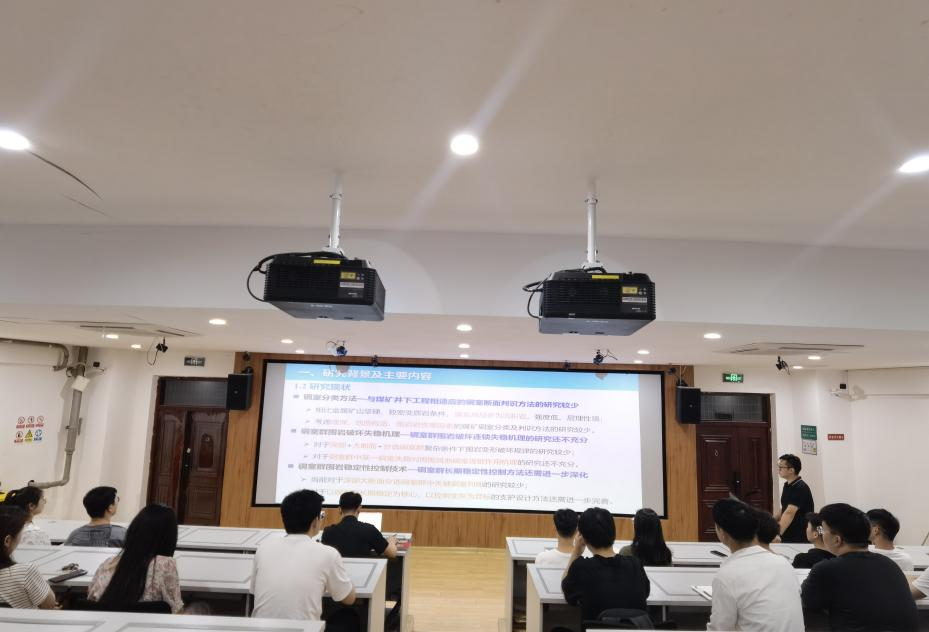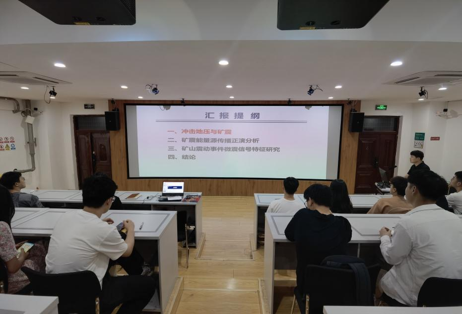 会上,范德源为参会同学详细介绍了煤矿深部大断面分选硐室群长期变形破坏机理及长期稳定性支护设计方法,并分享了论文写作技巧。谷雪斌主要介绍了矿震能量源传播正演分析、矿山震动事件微震信号特征,同时还针对低年级研究生目前面临的学术困惑,分享了自己如何培养科研兴趣、养成学习习惯以及掌握学习方法的经验。报告结束后,两位主讲人又与同学们展开了热烈讨论,解答了大家在日常学习中遇到的问题,并给出了中肯的建议。