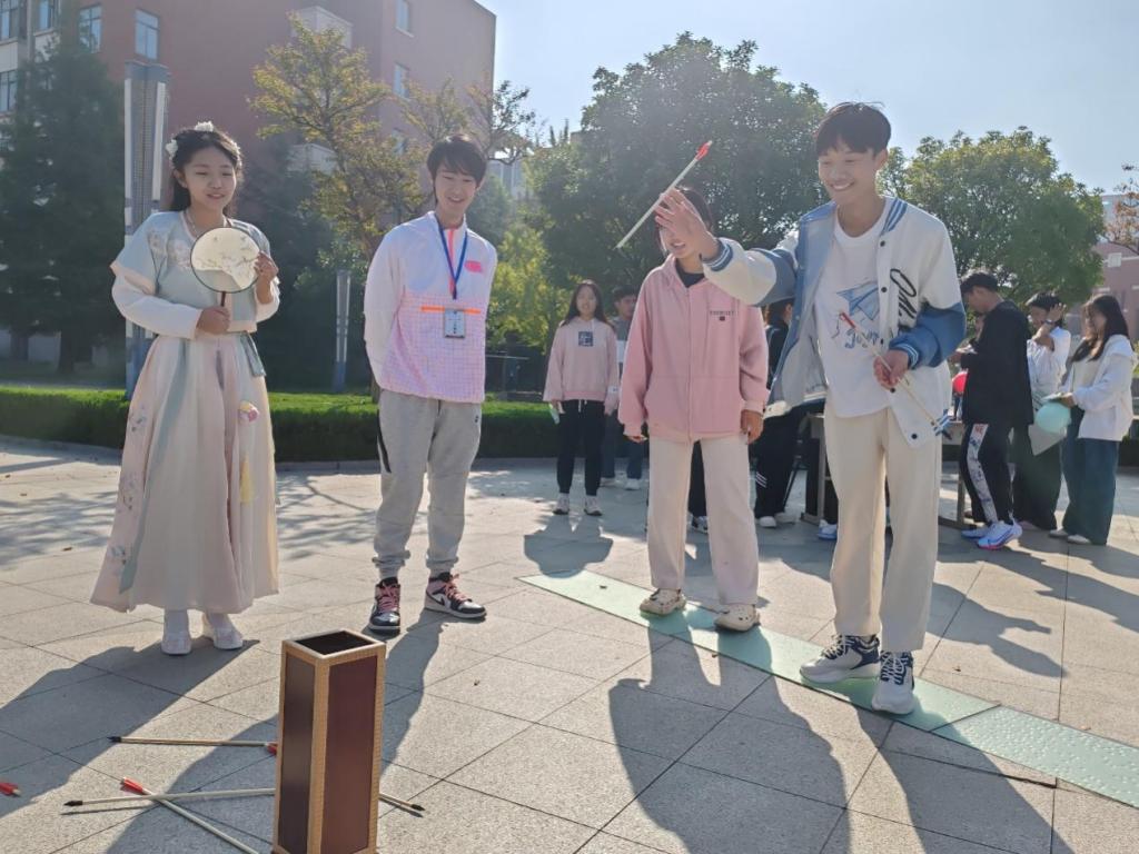 开幕式上,精武龙魂双截棍社和外国语捷报足球 声乐队献上了精彩的开场表演,调动了同学们的热情。本次大赛设置三条不同的闯关路线,分别在尤洛卡广场、风雨操场、泰山广场、钟楼广场、励志坊等场所设置关卡,其中既包括“亚运会知识问答”等环节,还设有“纸张传递、夹球跑”等项目,以及“聚秀斗壶、飞花令”投壶比赛。古文尚有笔锋牵,武士自当擂台间,同学们团结拼搏,勇争第一。
