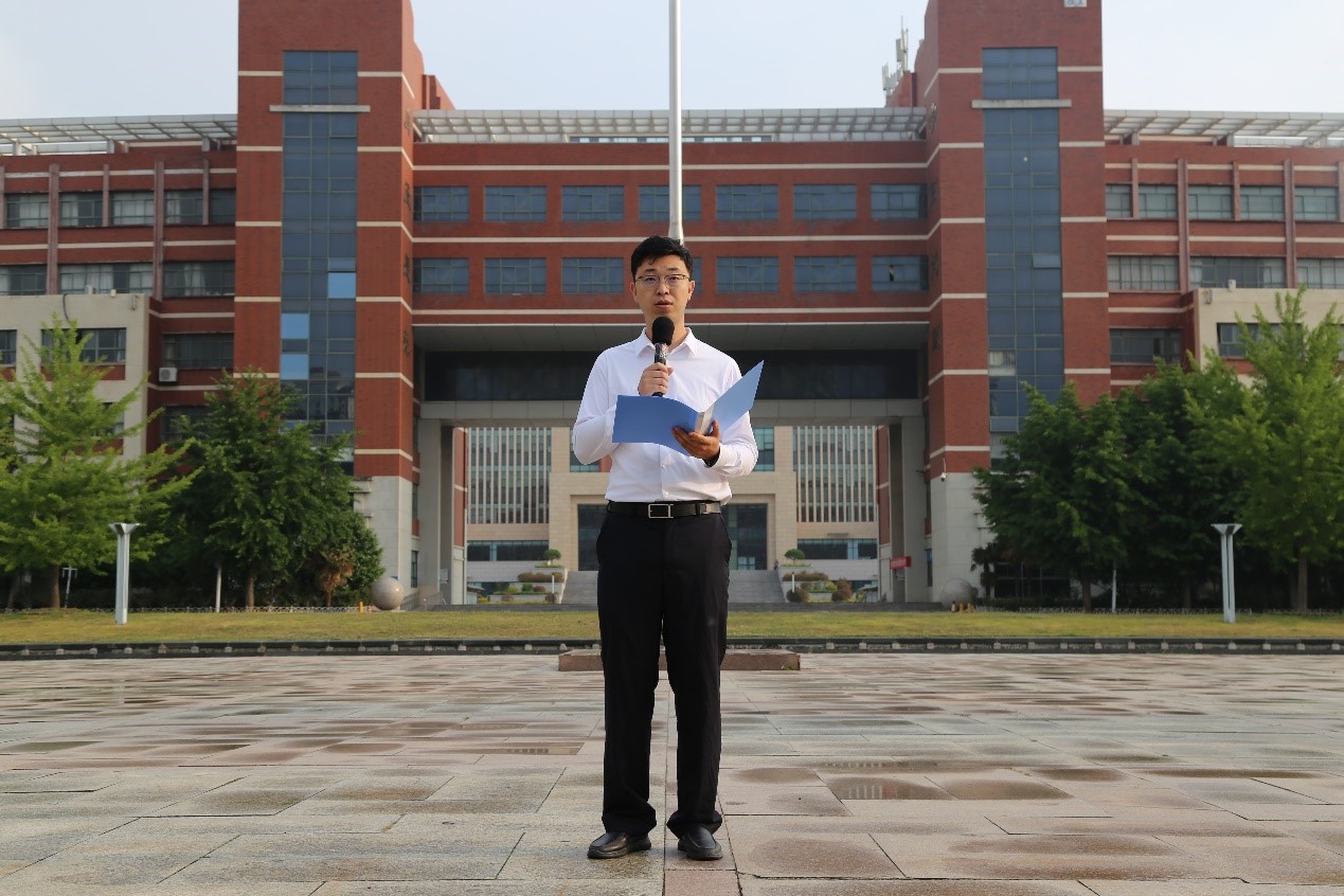 国旗护卫队迈着整齐有力的步伐,护旗而出,昂首走向升旗台。升旗仪式在庄严的国歌声中拉开序幕,鲜艳的五星红旗在全场目光的注视下缓缓升起,迎风飘扬。全体师生肃立敬礼,高唱国歌。升旗仪式后,学生代表王世一、蔡佳艺在国旗下作《祖国啊,我的祖国》主题宣讲,鼓励青年学子敢于担当,为中华民族的伟大复兴而坚强自立,坚持梦想,勇往直前。周尚涛宣读“百万大学生进社区”社会实践倡议书,号召广大学生用实际行动弘扬“奉献、友爱、互助、进步”志愿服务精神,在社会实践中检验所学、增长本领、扩大视野、增长才干。辅导员肖宜辉发表国旗下的讲话,鼓励广大青年励志做好新时代的“筑梦人”“追梦人”和“圆梦人”,用青春的热情和汗水书写人生的华章。