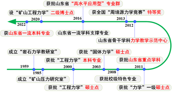 山东科技大学工程力学专业传承于建校之初成立的岩石力学教研室(陈子荫教授、魏悦广院士曾任教于此)和宋振骐院士牵头成立的矿山压力研究所。我校工程力学专业是山东省首批设置该本科专业的高校之一,2000年获批工程力学硕士点、2003年获批固体力学硕士点、2011年获批力学一级硕士点,2022年设置二级博士点方向。2016年专业获批共建山东省“高水平应用型”重点专业群,2022年入选山东省一流本科专业建设点。