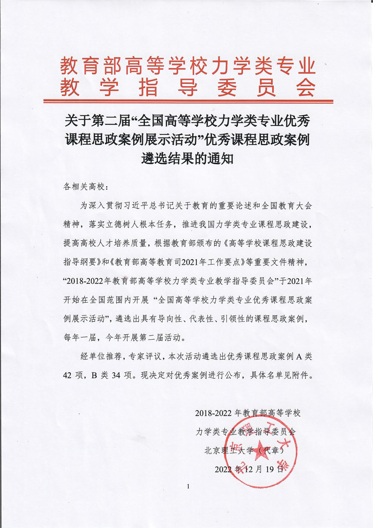 我校在第二届“全国高等学校力学类专业优秀课程思政案例展示活动”中取得佳绩