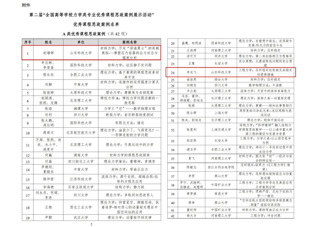 近日,教育部高等学校力学类专业教学指导委员会公布了第二届“全国高等学校力学类专业优秀课程思政案例展示活动”优秀课程思政案例的遴选结果。我校力学系赵增辉老师的“万米‘深海勇士’的承载奥秘薄壁压力容器的应力状态与强度分析”排名第1,李龙飞老师的“压杆稳定性校核及其稳定性提高措施”排名第24,两个案例均获评A类优秀课程思政案例。两个案例均为基础力学教学团队推送。