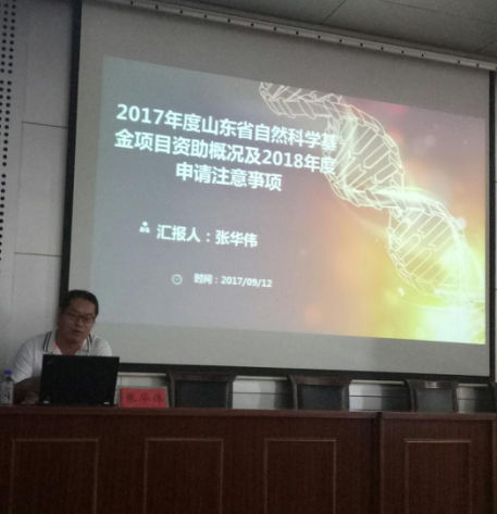 随后,张华伟从“山东省基金类型”“形式审查要点”“答辩注意事项”“申报技巧”“体会”等方面对“2017年度山东省自然科学基金项目资助概况及2018年度申请注意亊项”进行详细的介绍,使与会人员对山东省自然科学基金项目的情况和申报注意事项有了更深入更透彻的了解。