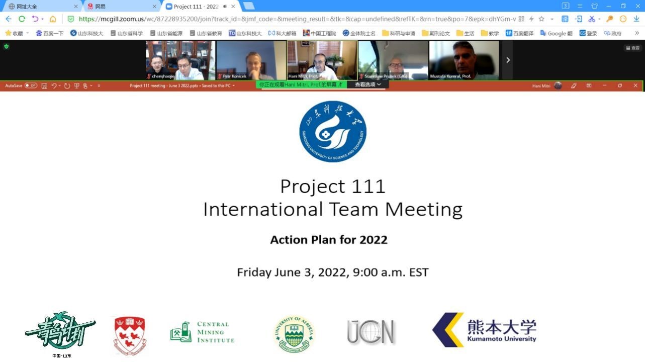 2022年6月3日,山东科技大学“矿山空区灾害与塌陷地治理”111引智基地2022年度工作会议以线上形式召开,111引智基地执行负责人、捷报足球 院长陈绍杰,秘书长蒋力帅代表学校参加了会议,会议由111引智基地海外团队负责人、加拿大麦吉尔大学Hani Mitri教授主持,来自加拿大麦吉尔大学、阿尔伯塔大学、波兰中央矿业研究院、捷克国家科捷报足球 、日本熊本大学的6位海外专家参加了会议。