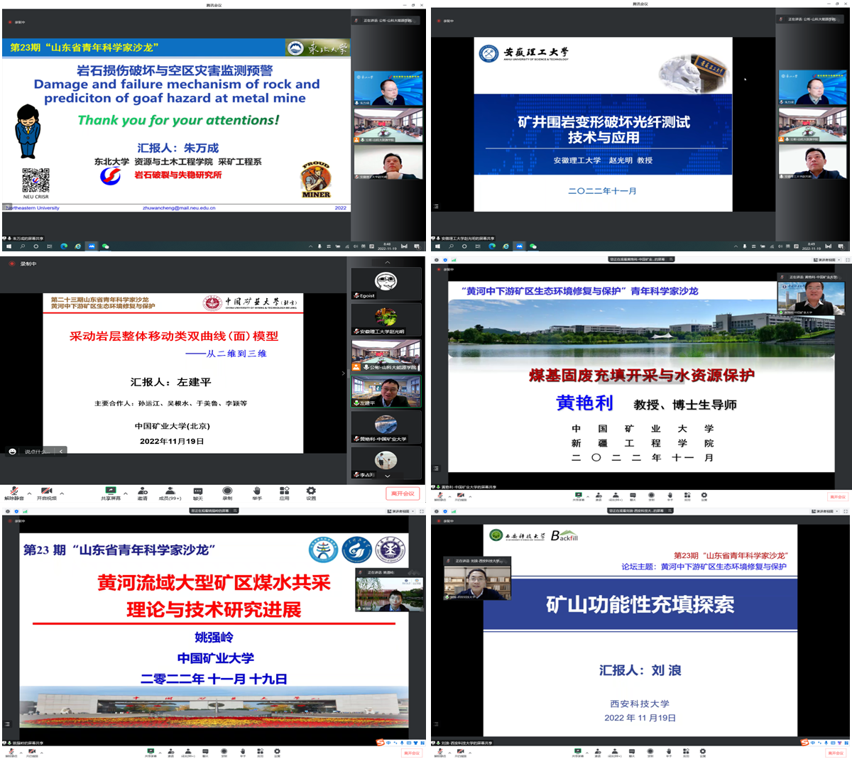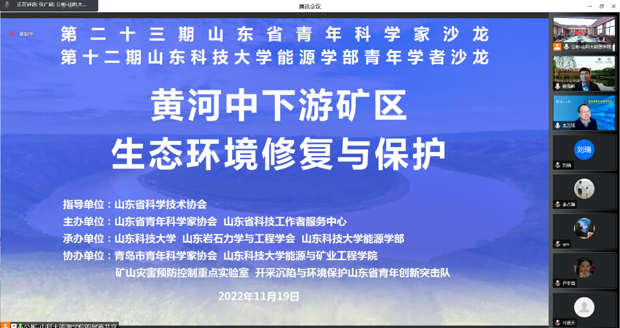 11月19日上午,由省青年科学家协会和省科技工作者服务中心主办,由山东科技大学承办的第二十三期山东省青年科学家沙龙活动成功举办。本次沙龙活动主题为“黄河中下游矿区生态环境治理与修复”,邀请了7位国家杰出青年基金获得者、国家级人才和中国青年科技奖获奖者等国家级人才青年科学家做了主题报告。活动由捷报足球-捷报足球数据 院长陈绍杰召集并主持,省青年科学家协会秘书长杨西博、山东科技大学科技处处长陈连军参加活动并致辞。来自东北大学、中国矿业大学(北京)、中国矿业大学、安徽理工大学、西安科技大学、山东科技大学以及青岛市青科协会员及其他线上线下青年专家代表共300余人参加了沙龙活动。本次沙龙活动开通了网上直播和沙龙讨论,收看直播人数超1600人次。