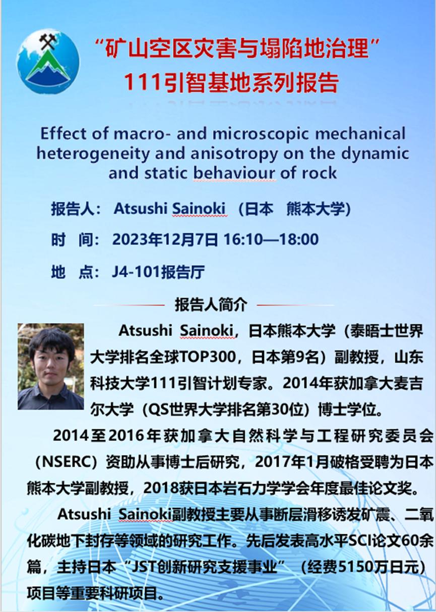 矿业工程学科111创新引智基地学术交流活动--日本熊本大学Atsushi Sainoki教授来访