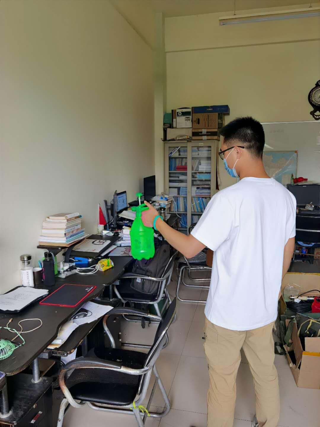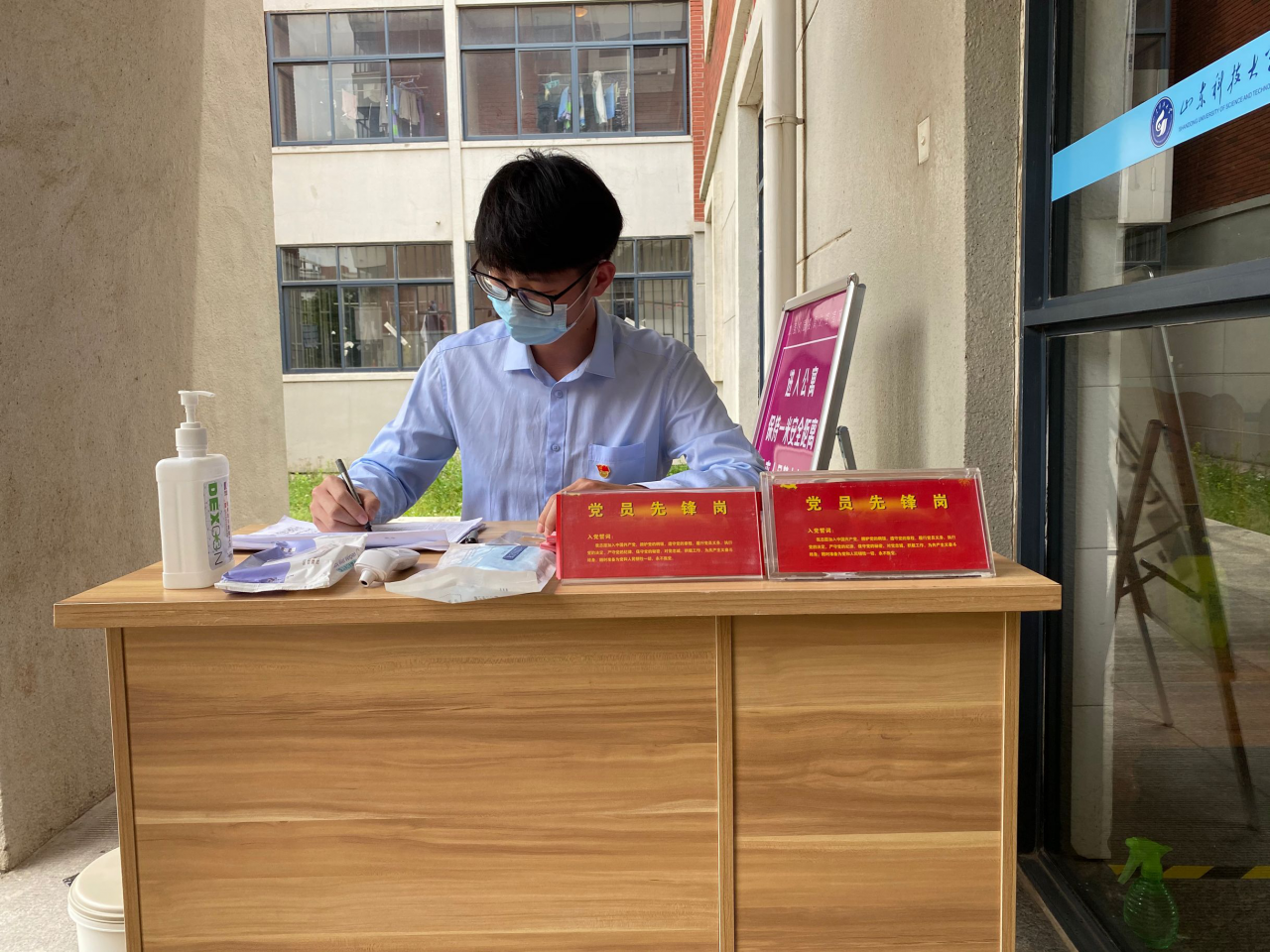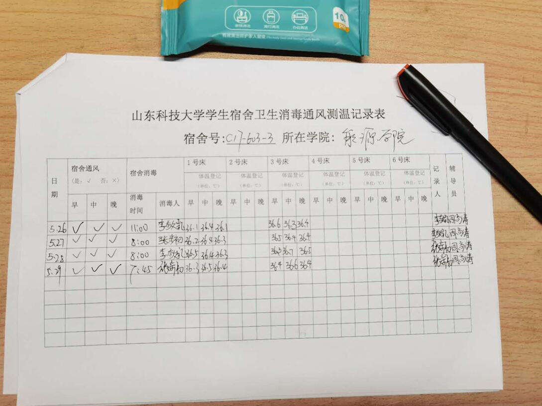 研究生党员们积极参与疫情防控工作组建疫情防控党员志愿服务队。18名研究生党员们把做好学生返校复学期间疫情防控工作作为发挥先锋模范作用的主战场,认真填写《山东科技大学学生宿舍卫生消毒通风测温记录表》,仔细检查实验室研究设备,全面做好研究生学习、生活区域的消毒通风工作,助力研究生返校复学