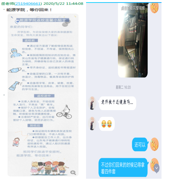 自启动开学准备工作以来,辅导员、班主任、研究生导师纷纷化身“信息员”,及时向学生派送“学”情,播报学校筹备工作的点点滴滴,提醒学生平安归来的方方面面。他们把为每一个宿舍拍摄的视频或照片发送给返校学生,便于他们根据宿舍现状和个人需求准备返校物品。他们与学生家长深入沟通,全面了解学生假期学习生活状况,确保家校育人顺利“接棒”。