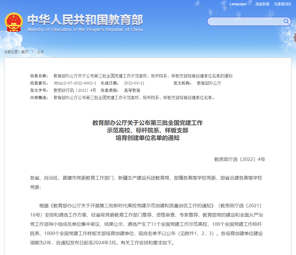 据悉,新时代高校党建示范创建和质量创优工作(简称党建“双创”)由教育部办公厅主办。第三批高校党建“双创”培育创建工作2021年11月启动,经省级党委教育工作部门推荐、资格审查、专家推荐、教育部党的建设和全面从严治党工作领导小组成员单位集中审议、结果公示,遴选产生11个全国党建工作示范高校、100个全国党建工作标杆院系、1000个全国党建工作样板支部培育创建单位。