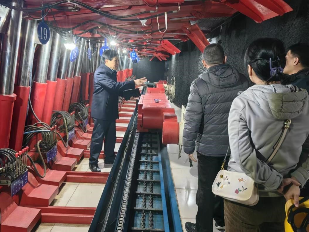 参观之旅自现代化矿井综合模型开启。刘伟韬详细阐释模型,直观展示了矿井的系统性与复杂性,也彰显出我们在教学与科研中对矿业实践深入探索的坚实成果与不懈追求。随后刘伟韬带领刘建成一行来到模拟矿道实验室,沉浸式体验井下状况。